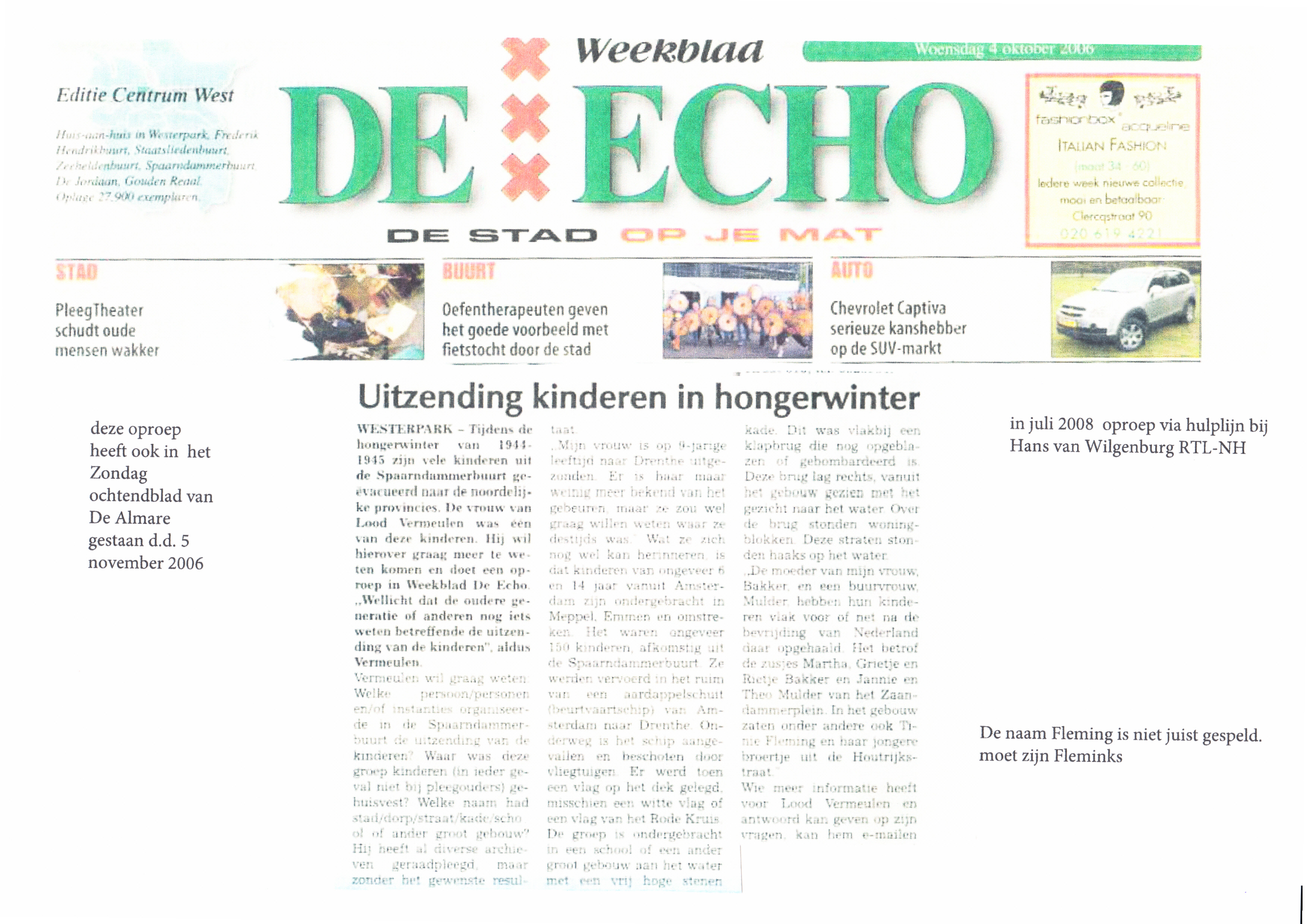 Vanaf 4 oktober 2006 t/m 8 november Oproep in de ECHO en ALMARA Reacties van reageerders na lezen van de oproep in de ECHO of ALMARA worden nog verder ingevuld Hieronder het bericht zoals geplaatst in de ECHO en ALMARA